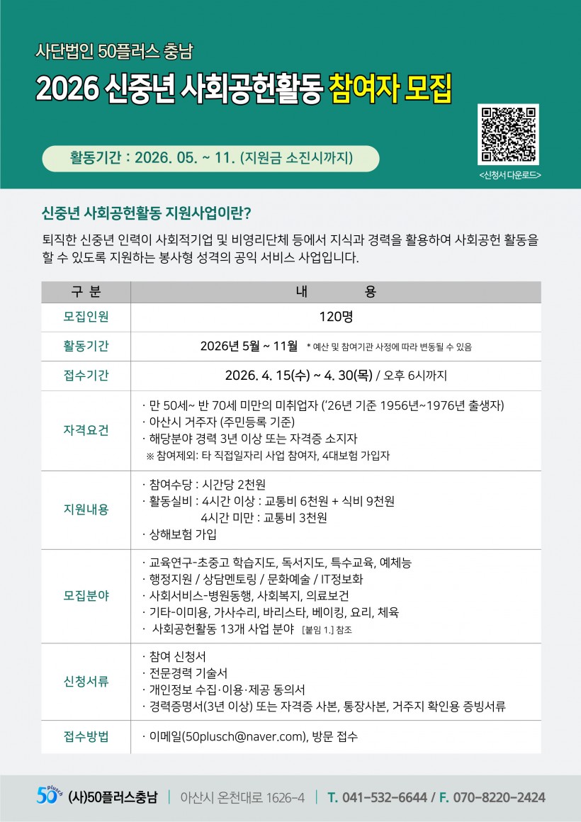 2026년 신중년 사회공헌활동 지원사업 참여자 모집을 안내합니다.